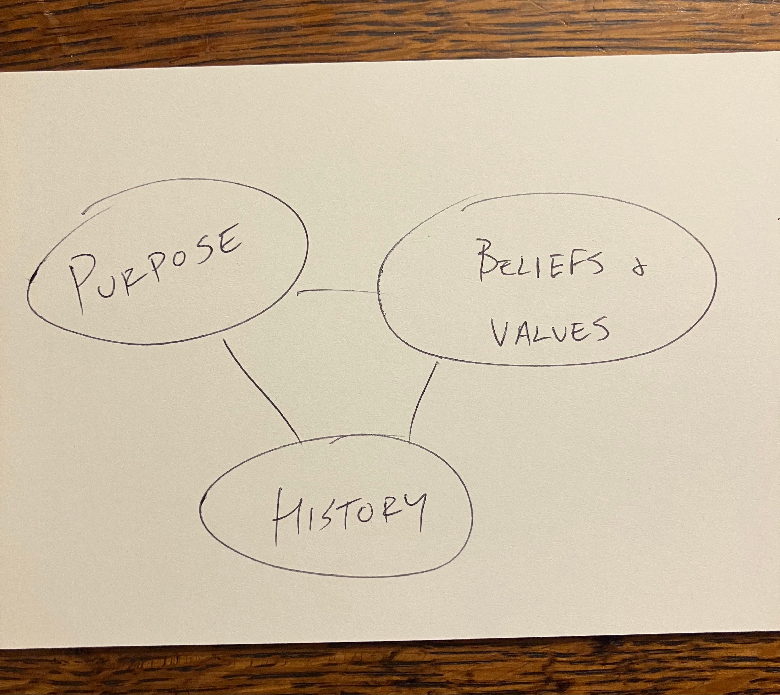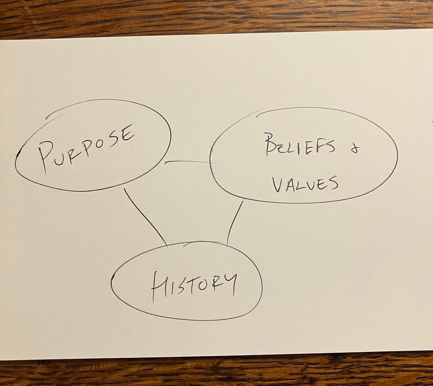 Imagine that a community of people is built on three pillars: shared history, shared beliefs and values, and shared purpose. You can think of it in terms of time as well. Shared understanding of the past, shared experience of the present, and shared vision of the future. There are slight variations at the individual level, but by and large the members of the community have commonalities around these three pillars.
